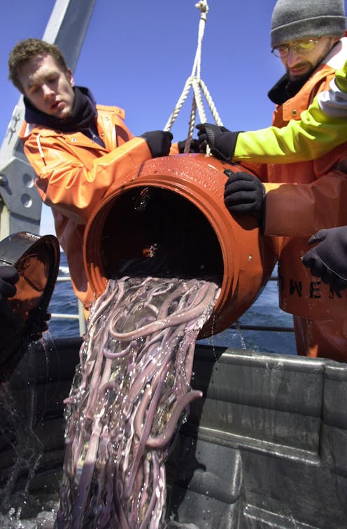 Because they are popular to eat, some hagfish populations are fished too much. Fishermen in the United States catch them and send them overseas to be eaten. The U.S. government has created rules to limit the number of slime eels fishermen can catch.