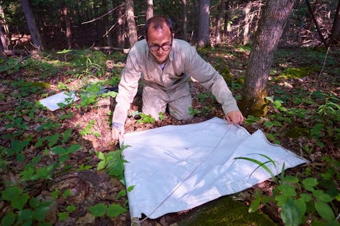 Allen: We measure it by what is called “drag cloth sampling.” We drag a 1 meter by 1 meter white cloth along the forest floor. Ticks that are searching for a host, which we call questing, will attach to the cloth as it passes over them. At each of our plots we drag the cloth along the forest floor for 200 meters and check it every 10 meters. This is the standard way to measure tick abundance.