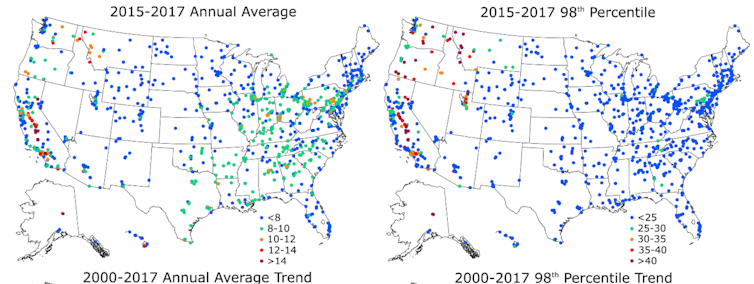 Average annual fine particulate levels in the U.S. fell by nearly 25% between 2009 and 2016, but this trend may be reversing. Increasingly frequent and severe wildfires, such as those currently raging in California, are one likely source.