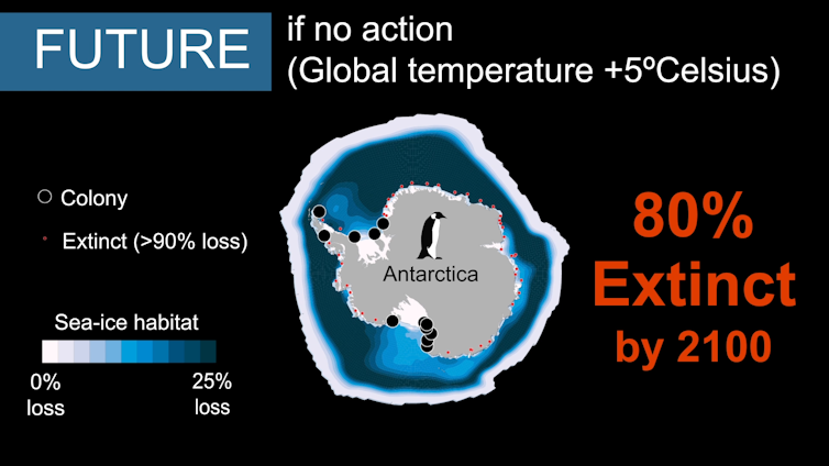 Our newly published study found that if climate change continues at its current rate, Emperor Penguins could virtually disappear by the year 2100 due to loss of Antarctic sea ice. However, a more aggressive global climate policy can halt the penguins’ march to extinction.