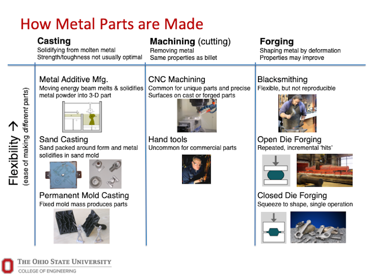 Machining cuts away raw material to get a desired shape; casting involves pouring molten metal into a mold; and forming or forging deforms and squeezes metal into new shapes. Casting and forging to shape usually needs custom molds or dies that can take considerable time and expense to design and manufacture, but once running are very productive; parts are inexpensive with highly reproducible properties. This is why nuts and bolts can be cheap and reliable.