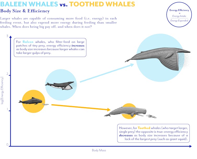 Because of a lack of large enough prey, we found that toothed whales’ energetic efficiency decreases with body size – the opposite of the pattern we documented for baleen whales. Therefore, we think the ecological limits imposed by a lack of giant squid prey prevented toothed whales from evolving body sizes greater than sperm whales.