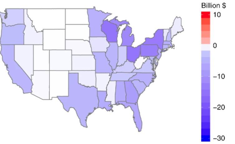 Our study shows that this approach would reduce PM2.5-related emissions in each state. Progress would be greatest in northern and eastern states, including Ohio and Pennsylvania. These regions have many large industrial sources and are densely populated, which means that many people benefit from cleaner air.