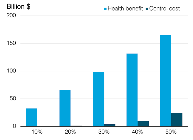 Our model showed that reducing emissions from these sources – mainly by electrifying them – could cut projected national air pollution-related deaths in 2050 in half very cost-effectively. Overall national health benefits from these reductions would be roughly seven times the cost of the pollution controls. As many studies have found, air pollution controls tend to be very cost-effective because these emissions cause people to die prematurely through cardiovascular diseases, stroke, lung cancer and other long-term illnesses.