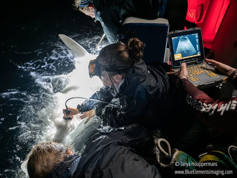 Wriggling baby tiger sharks, up to 40 of them packed tightly together inside their mother’s womb, appear in front of my eyes. The image also appears on a screen held by another team member on the boat, and everyone cheers as they gather around to take a peek into the secret world of unborn sharks. We spy on them as they pump fluid through their still-developing gills, and we watch in awe as they wiggle around, blissfully unaware that anything extraordinary is happening outside in the world. Once we have enough data on the approximate size of the offspring – which gives us an idea of how far along the pregnancy is – it’s time to tag the mama shark.