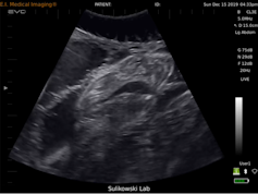 Just like the ultrasounds used on humans, we use a mobile ultrasound machine to figure out if a shark is expecting. I put on a pair of goggles that allow me to see everything the ultrasound sees, lean over the side of the boat, and place the probe onto the upside down shark’s abdomen. The image is usually fuzzy at first as water splashes over the shark and up onto the boat. The team holds the shark still as I slowly maneuver the probe along her belly. Then, if she’s pregnant, something magical happens.