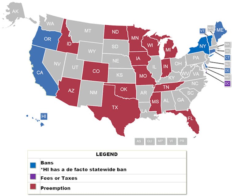 Over several decades leading up to 2020, many U.S. cities and states worked to reduce waste from single-use disposable objects such as straws, utensils, coffee cups, beverage bottles and plastic bags. Policies varied but included bans on Styrofoam, plastic bags and straws, along with taxes and fees on bottles and cups.