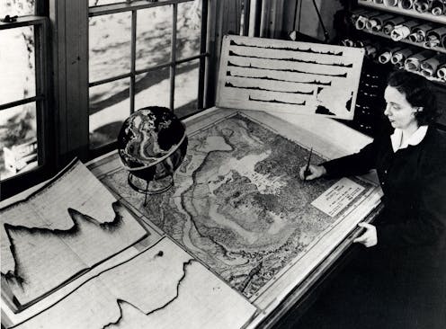 July 30 marks the 100th anniversary of the birth of Marie Tharp, a geologist and oceanographer who created maps that changed the way people imagine two-thirds of the world. Beginning in 1957, Tharp and her research partner, Bruce Heezen, began publishing the first comprehensive maps that showed the main features of the ocean bottom – mountains, valleys and trenches.