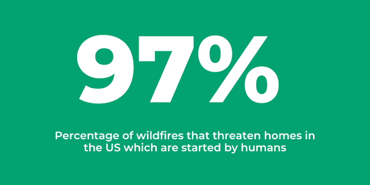 To make matters worse, humans are responsible for starting almost all the wildfires in developed areas that threaten U.S. homes. In a newly published study, we show that through activities like debris burning, equipment use and arson, people ignited 97% of home-threatening wildfires in the wildland-urban interface between 1992 and 2015. For comparison, when fires in undeveloped areas are also counted, humans started 84% of all wildfires between 1992 and 2012, with lightning as the main natural cause.