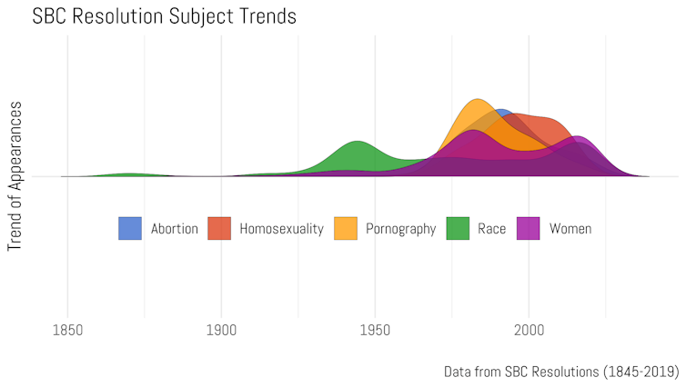 I’m a religion data analyst who wrote a computer script to collect and organize the text of all the resolutions passed at the annual meeting data back to 1845 to see if there were any patterns. What became clear was that many of the “bread and butter” culture war issues that fueled the SBC 20 years ago – such as abortion and homosexuality – have faded and been replaced by a new set of issues that seem to be furthering the divide between conservatives and more moderate members of the Southern Baptist Convention.