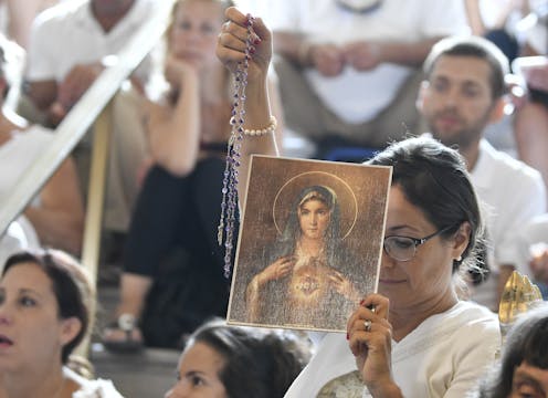 A woman holds a rosary and a picture of the Virgin Mary during a 2019 hearing in Albany, N.Y., challenging the constitutionality of the state's repeal of the religious exemption to vaccination. AP Photo/Hans Pennink