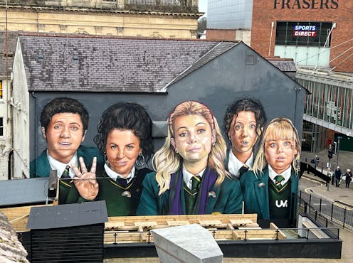 He sent me a picture of a mural in Derry, painted one year after Brexit, which celebrates Lisa McGee’s hit TV show “Derry Girls.” Launched in 2018, the comedy follows the fictional lives of five teenagers growing up in the troubles. Though the show focuses on a Catholic community, it defuses the “us and them” way of thinking about identity. An episode called “Across the Barricades” satirizes facile attempts to get Catholic and Protestant kids to bond; it ends when they recognize their common enemy: parents.
