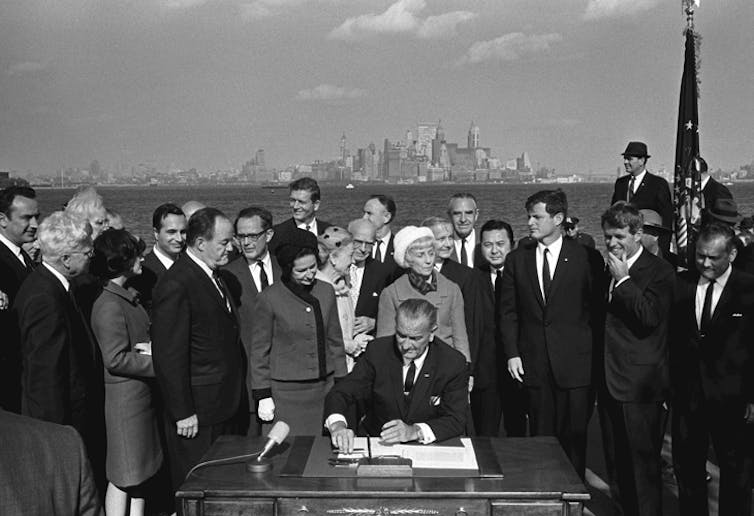 Ellis Island itself – where Lyndon Johnson signed the 1965 act – transformed in the public mind from a set of abandoned buildings to a prominent symbol of European immigrants’ struggles and triumphs.