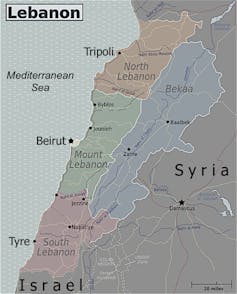 Lebanon’s administrative divisions reflect its religious divisions, with Shiites concentrated in the country’s south and east and Maronite Christians dominating central areas near Beirut. Globe-trotter/Perry-Castañeda Library Map Collection - University of Texas Library Online, CC BY-SA