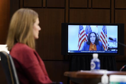 On the first day of hearings for Judge Amy Coney Barrett, vice presidential candidate Kamala Harris framed the nomination as part of a plan to subvert democratic values.