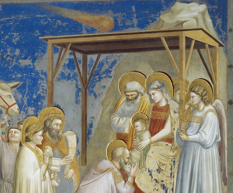 Scholars have suggested that Giotto did this as an homage to Halley’s Comet, which astronomers have determined was visible in 1301, on one of its regular flights past the Earth. Astronomers have also determined that Halley’s Comet passed by the Earth in or around 12 B.C., between five and 10 years before most scholars argue that Jesus was born. It is possible that Giotto believed Matthew was referencing Halley’s Comet in his story of the star.