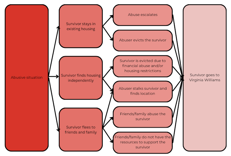 The 19 survivors ineligible for services were given varied reasons, often involving their inability to prove they were homeless. Ten participants told us that at the time they left Virginia Williams, they and their children had nowhere to go. Leaving without assistance prompted difficult choices, including maxing out credit cards to stay in hotels or begging to stay with family and friends in conditions that created new problems.