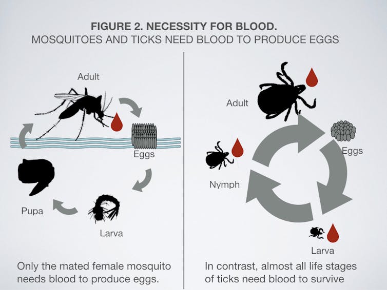 Only the female mosquito takes a blood meal to make eggs, but almost all life stages of ticks need blood to survive.