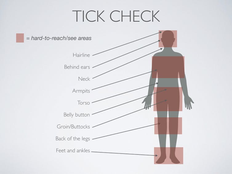 Tick checks are absolutely crucial. People usually follow this routine after going outdoors, but sometimes forget. And, they often avoid places that ticks love, such as between your legs. Hard-to-reach areas are prime real estate for blood-feeding parasites that don’t want to be dislodged, so make sure to check: the hairline (especially on children), torso, belly button and groin. If necessary, get assistance or a mirror and a bright light.