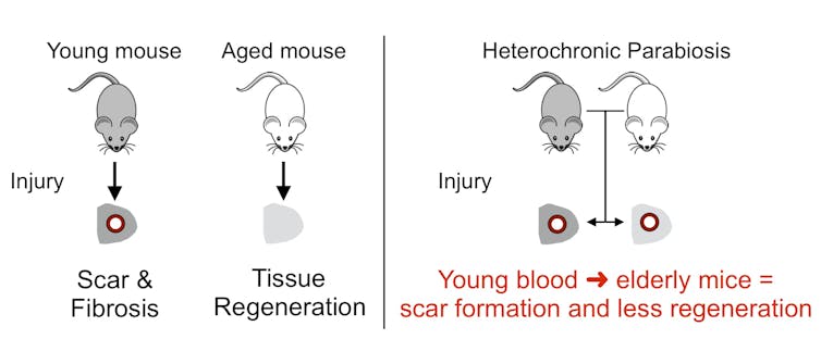 First, we wanted to see if this change was due to a circulating factor in the blood. We exchanged blood between young and old mice through a technique called parabiosis. When elderly mice were exposed to young blood, their skin no longer regenerated as well. Thus, young blood contained a circulating chemical that promotes scar formation and prevents tissue regeneration from occurring.
