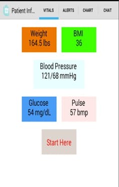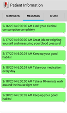 As patients left the clinic, they were given a Bluetooth-enabled weight scale, a blood pressure cuff, blood glucose meter and MyHeart installed on their smartphone. The patient would measure vitals daily and log their symptoms in the app. The system collected daily data such as weight, blood pressure, blood glucose and activity (steps) along with answers to five questions about their symptoms, which they rated on a scale of 1-10 based on guidelines from American Heart Association. The MyHeart app provided motivational messages along with reminders for any missing vital data.