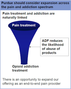 Despite years of negative press coverage, unwanted attention from regulators, multi-million dollar fines and several major lawsuits, Purdue staff and owners sought to expand the company’s sights beyond its usual array of opioid painkillers. Purdue planned to become an “end-to-end pain provider,” by branching into the market for opioid addiction and overdose medicines, looking to peddle these medicines even while the company continued to aggressively market its addictive opioids. Internal research materials coldly explained the rationale behind this plan: “Pain treatment and addiction are naturally linked.”