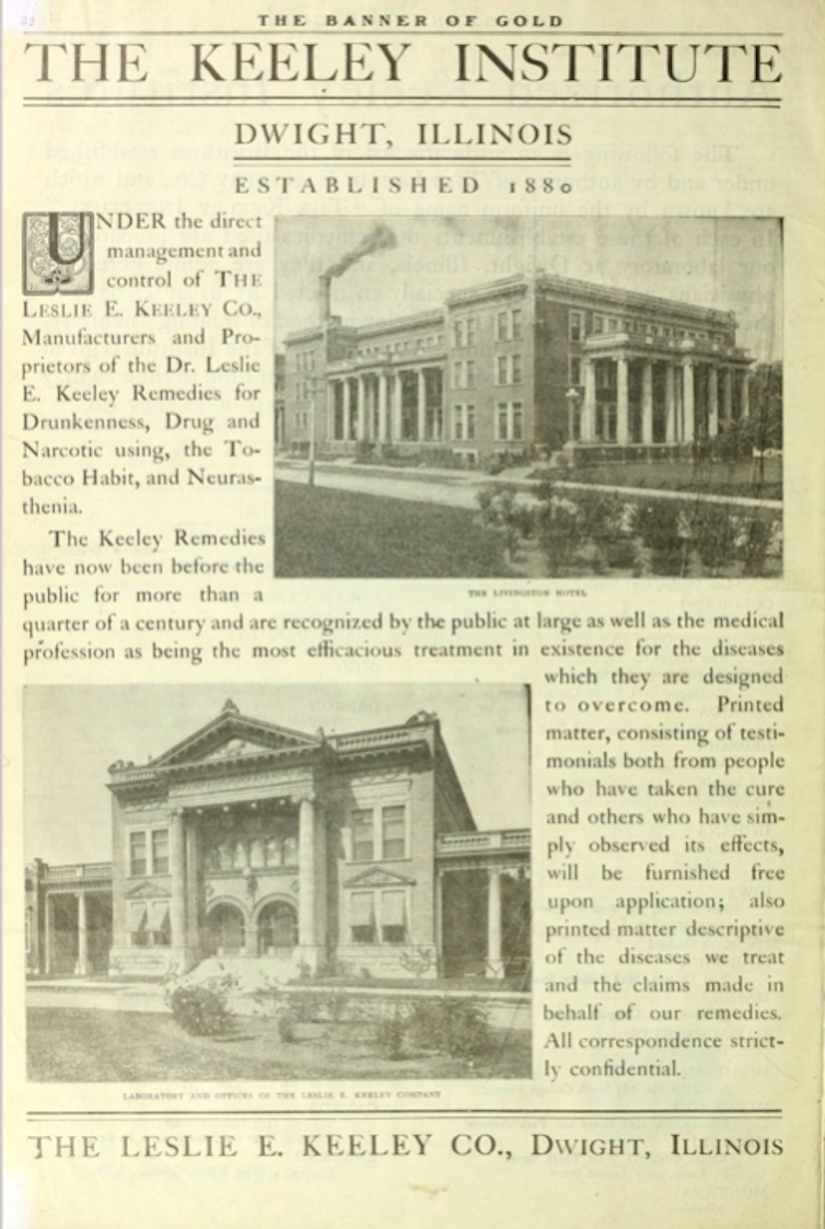 Scores of Keeley Institutes sprang up around the country in the late 19th century, a testament to the popularity of Keeley’s “Gold Cure,” which he marketed for alcoholism and drug addiction. No up-and-coming Gilded Age city was complete without a Keeley Institute. At the height of the Gold Cure craze, there were 118 institutes serving 500,000 Americans between 1880 and 1920. Even the federal government had a contract with Keeley to provide the Gold Cure to addicted veterans. Although injections of the Gold Cure had little intrinsic medical value, historians believe that socializing with other like-minded patients in the Keeley Institutes may have helped some patients recover from addiction.