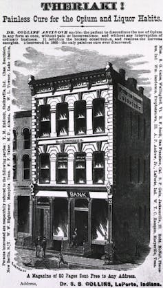 Samuel B. Collins of La Porte, Indiana, inventor of the “Painless Opium Antidote,” one of the era’s most popular brands, insisted that his product was not addictive. Collins was proven a fraud, however, by a skeptical Maine doctor, who in 1876 sent off a sample of Collins’ product to several chemists for analysis. Their tests indicated that the Painless Opium Antidote contained enough morphine to perpetuate opiate addiction, actually fueling demand for Collins’s product, rather than curing the underlying addiction.
