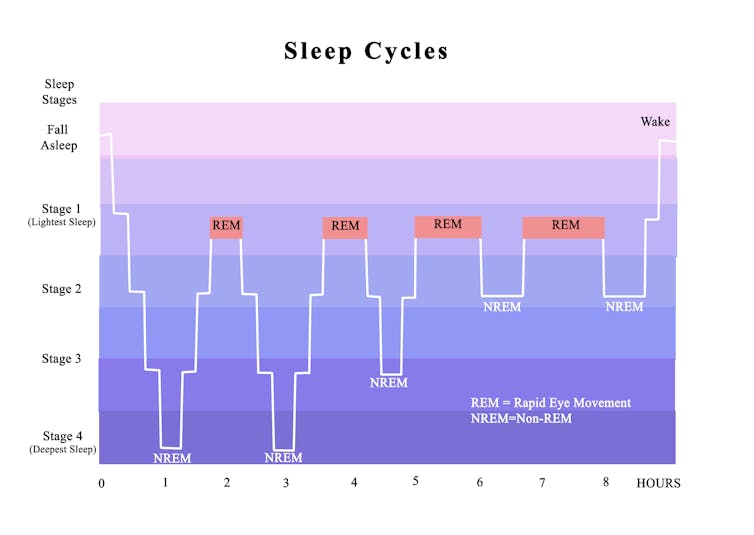 We tend to cycle from the three stages of NREM into REM sleep four to six times per night. The first portion of the night is mostly NREM deep sleep and the last portion consists of mostly REM sleep.