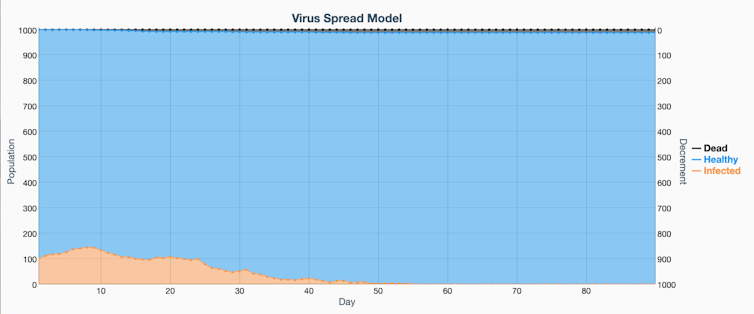 For example, let’s assume that 100 people are infected out of a population of 1,000, with one in 10 wearing masks, keeping appropriate distance and quarantining if necessary. The model shows that 30 days later, the virus would have killed 156 people. After three months, the death toll reaches 460 – with 510 now infected.