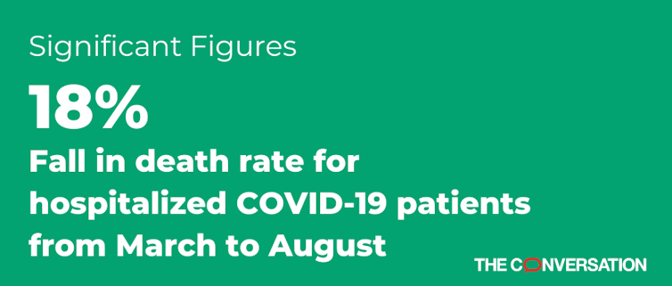Two large recent studies show that people hospitalized for COVID-19 in March were more than three times as likely to die as people hospitalized for COVID–19 in August.