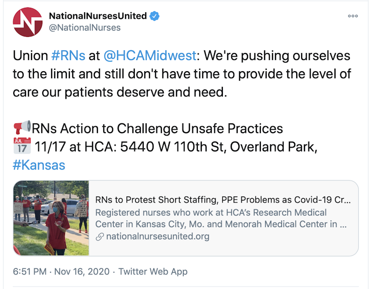 Working conditions have sparked protests in front of the White House and across the country. In May, the New York State Nurses Association filed three lawsuits against the New York State Health Department and two hospitals over safety.