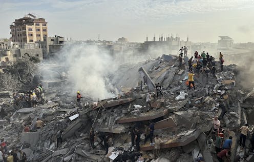 Palestinians look for survivors after a Israeli strike in Gaza on Oct. 31, 2023. AP Photo/Doaa AlBaz