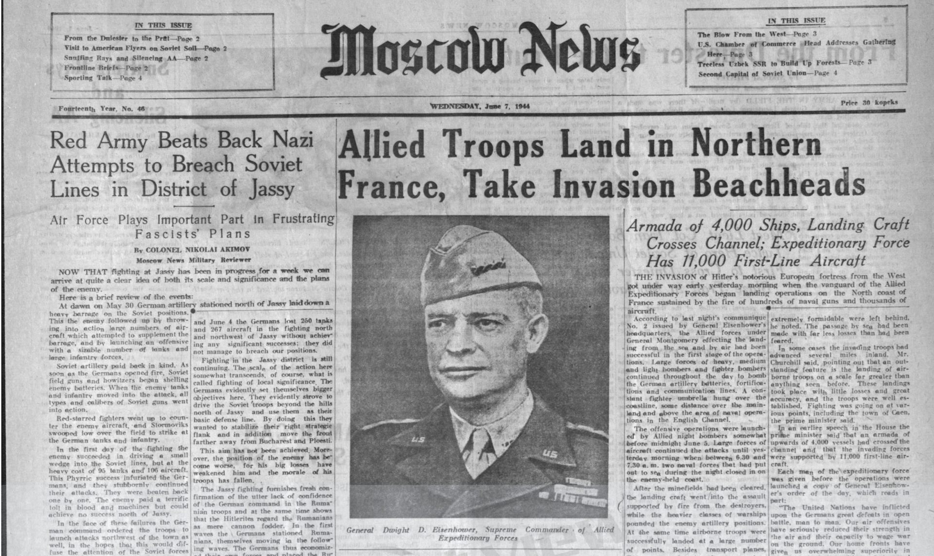 In the Moscow News, the Soviet government’s English-language paper, D-Day figured much more prominently, though it had to share the limelight. A front-page article included a photo of Eisenhower. “Allied Troops Land in Northern France, Take Invasion Beachheads” was the boldest headline in the June 7, 1944. But it was printed alongside an article on the major Red Army victory at Jassy, Romania.