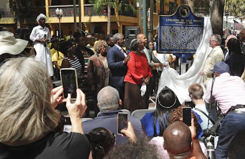 Descendants of July Perry attend a 2019 ceremony unveiling a historical marker of his lynching. AP Photo/John Raoux