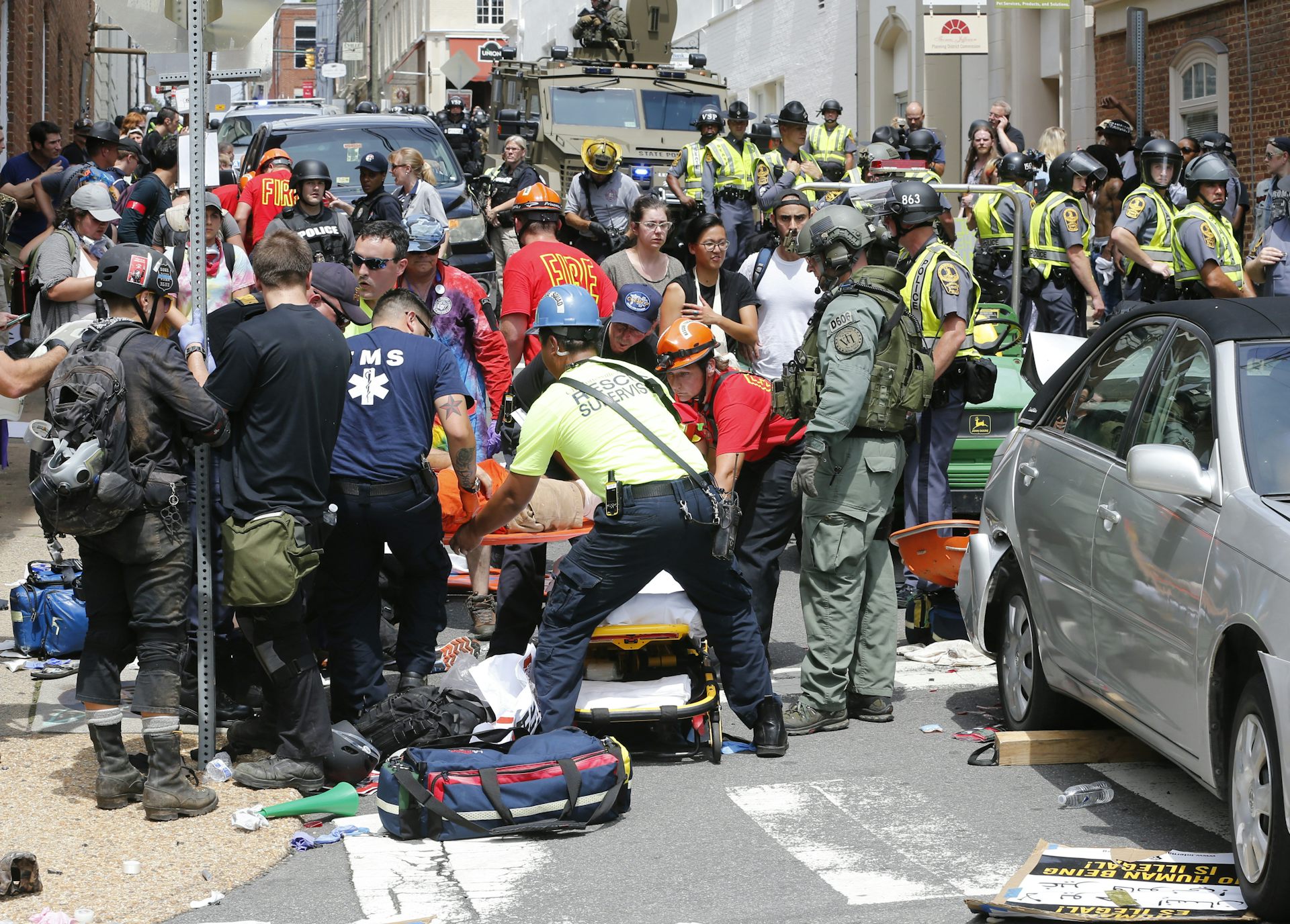 Amid violent clashes with counterprotesters on the second day, a neo-Nazi sympathizer drove into a crowd, killing a 32-year-old woman and injuring many others.
