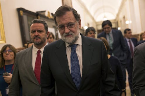 One is the heritage and beliefs of his party, the Partido Popular. Founded by Francoists, senior officials of the old dictatorship, its ideology has authoritarian tones and focuses on order and Spanish unity. They don’t recognize a Catalan national right to self-determination, and believe all of Spain would have to agree on Catalan secession since Catalans are Spanish.