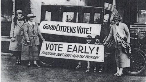 In 1928, for example, the league partnered with the fledgling NBC radio network to bring its “Citizenship School of the Air” to 15 million listeners. At a time when callers couldn’t dial direct, telephone operators – an overwhelmingly female labor force – reminded election-day callers in 1924 to be sure to vote. Articles and ads in women’s magazines such as the Ladies’ Home Journal nudged millions of its female readers to take advantage of their newfound right to vote.