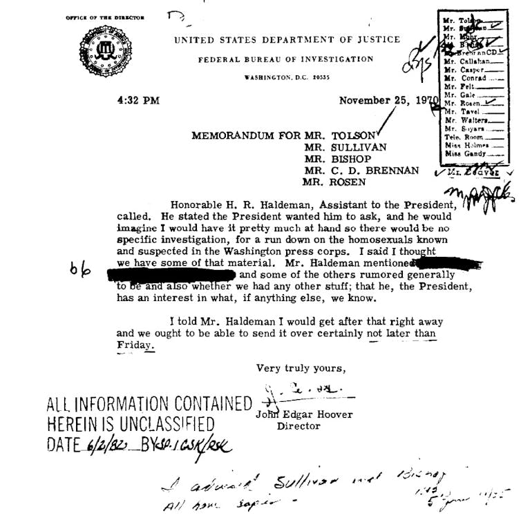 Handwritten notes on Hoover’s memo – the only record of the request, sent to Hoover’s top FBI officials – indicate that the FBI compiled the requested information and sent it to the White House in letter format, dated Nov. 27, 1970. To date, this letter has not surfaced either at the FBI or among the Nixon papers. Because we don’t have the letter, we also do not know the exact content of the information Hoover shared, or whether and how Nixon might have used it against reporters.