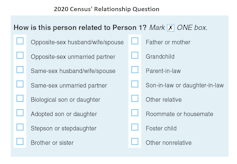 The 2020 census will allow respondents to describe their relationship to members of their household using the categories “same-sex husband/wife/spouse” and “same-sex unmarried partner.” In the past, this was not the case.