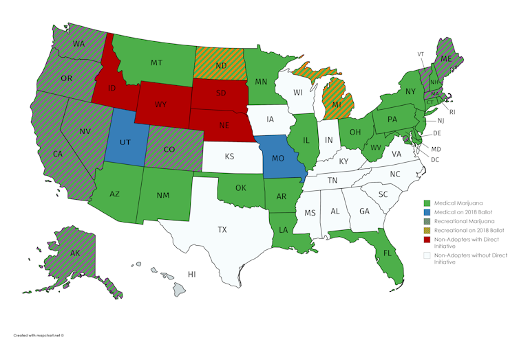 Of the 19 U.S. states that have no form of legal marijuana, only six – Idaho, Wyoming, South Dakota, Nebraska, Utah and Missouri – allow for direct initiatives.
