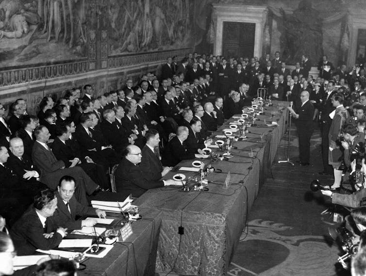 The driving idea behind the EU, which was called the European Economic Community when it was created in the 1950s, was to pacify Europe by integrating its economies. After two bloody world wars, Europeans hoped that eliminating barriers between countries and encouraging cooperation in common institutions would bring both economic vitality and lasting peace.