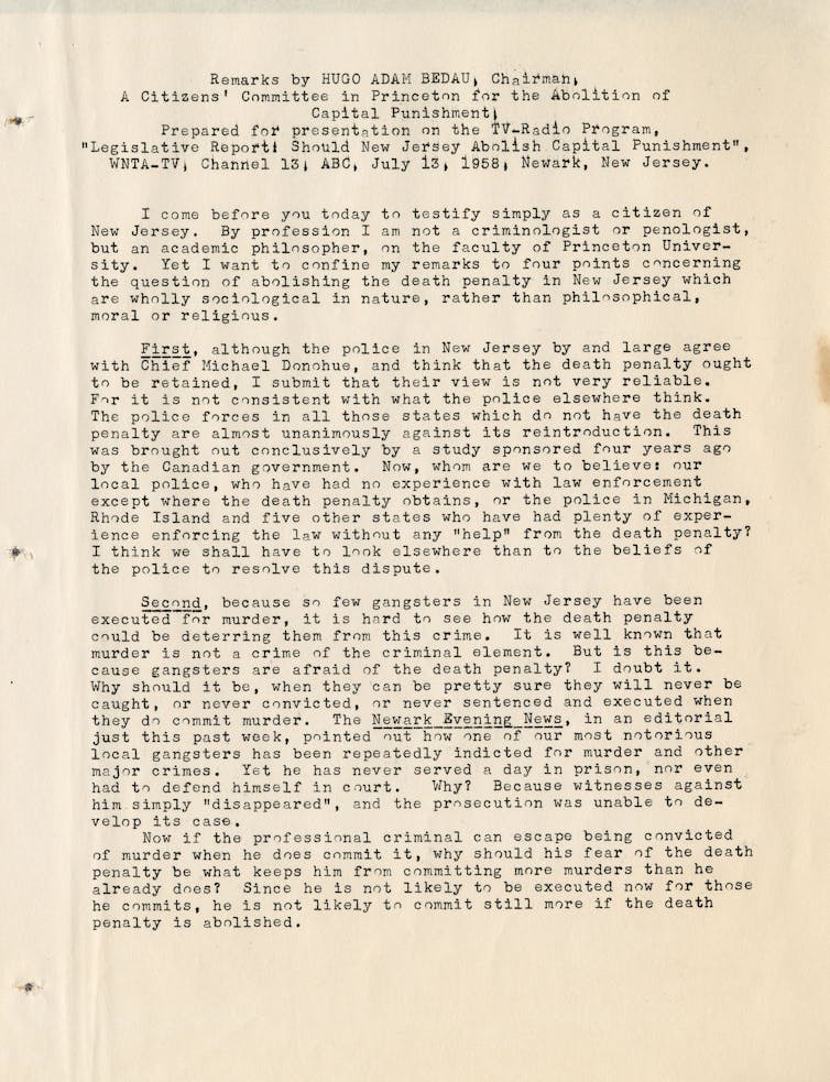 We also have collected the work of notable scholars. For example, the National Death Penalty Archive houses research completed by the late David Baldus, known primarily for his analysis of racial disparities in the administration of the death penalty; the writings of the late Hugo Adam Bedau, perhaps the country’s leading philosopher on issues of capital punishment; and the papers of the late Ernest van den Haag, a prolific academic proponent of capital punishment.