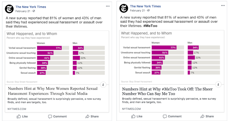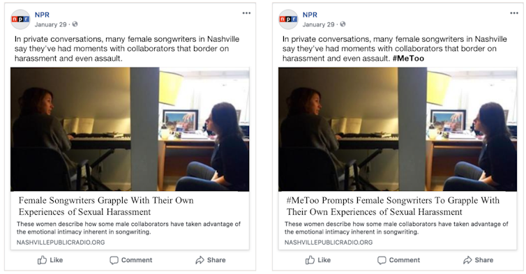 We tested whether people responded differently to the presence or absence of political hashtags – particularly the most widely used #MeToo and #BlackLivesMatter – in news articles published on Facebook by major news outlets, such as The New York Times and NPR.