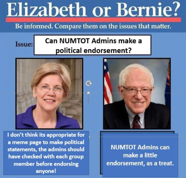 Four years later, the politics of memes have evolved. NUMTOT’s endorsement actually represents an organized political decision that, in turn, has been acknowledged and celebrated by a candidate.