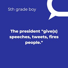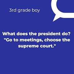 When we asked the children, “What kinds of things do you think the president does?” children largely provided factual descriptions of the president’s daily activities.