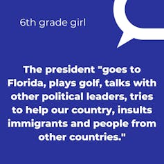 And in 2018, a sixth-grade girl said the president “goes to Florida, plays golf, talks with other political leaders, tries to help our country, insults immigrants and people from other countries.”