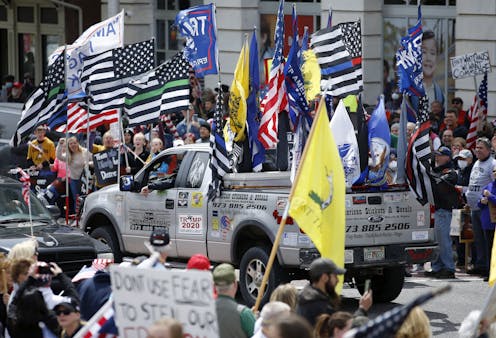 Protesters’ signs didn’t really downplay the threat of the virus, but rather compared it with potential harm from the lockdown. For instance, a sign in Denver was headed “Trading Lives” and featured a scale with virus deaths on one side, with unemployment, suicide and homelessness on the other.