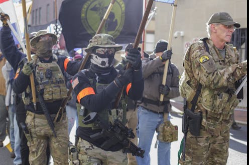 Militia groups don’t typically include race in their overt ideology, but some white supremacist groups have also adopted the “boogaloo” outlook and sometimes attend the same rallies as they advocate for a race war or an all-white nation.