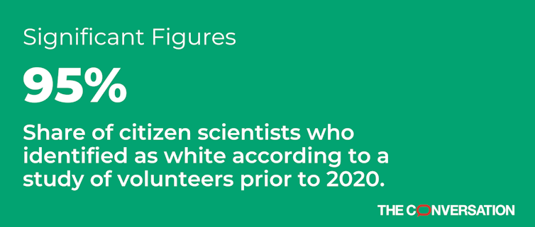 Participating in citizen science is linked to personal benefits like learning new skills and building community. If citizen science is only reaching educated white science professionals, then it’s concentrating the benefits of participation among this group.